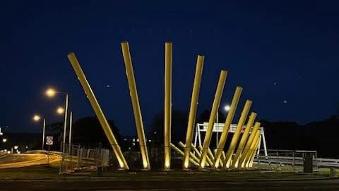 The Burnie Gateway, known as the Welcome Gesture, is a striking public artwork featuring a series of tall yellow poles that form a sweeping arm-like motion to greet visitors entering the city.